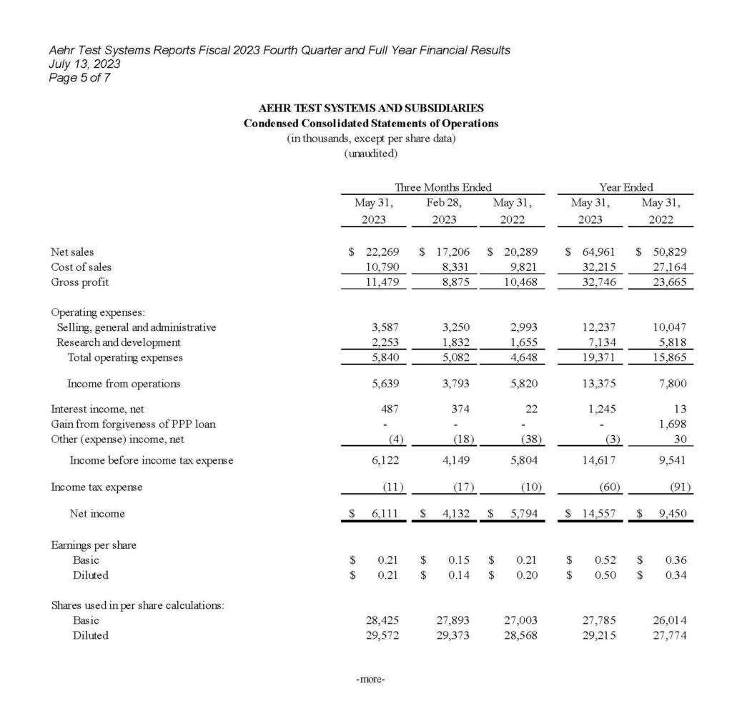 Fremont, CA (July 13, 2023) – Aehr Test Systems (NASDAQ: AEHR), a worldwide supplier of semiconductor test and production burn-in equipment, today announced financial results for its fiscal 2023 fourth quarter and full year ended May 31, 2023.
