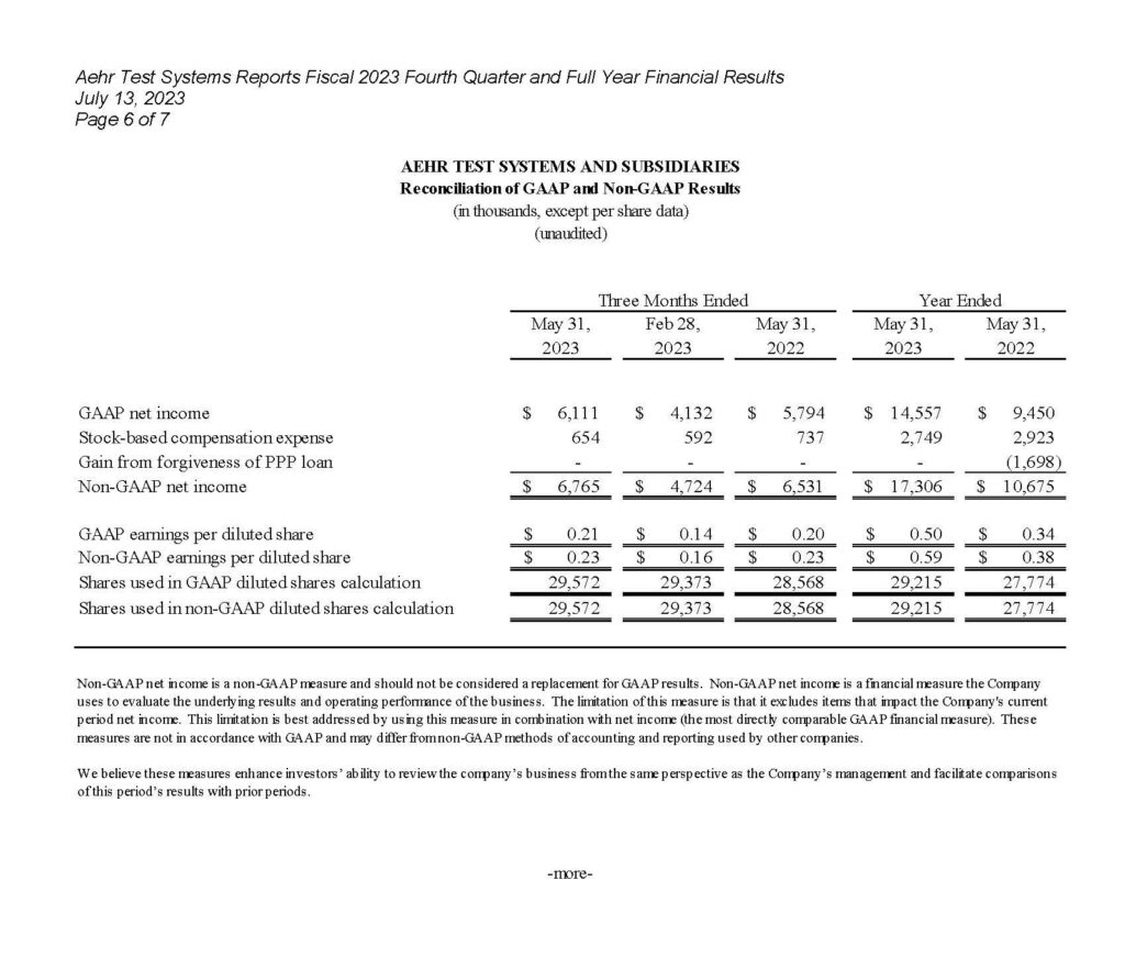An explanation of the use of non-GAAP financial measures and a reconciliation of Aehr’s non-GAAP financial measures to the most directly comparable GAAP financial measures can be found in the accompanying tables.
