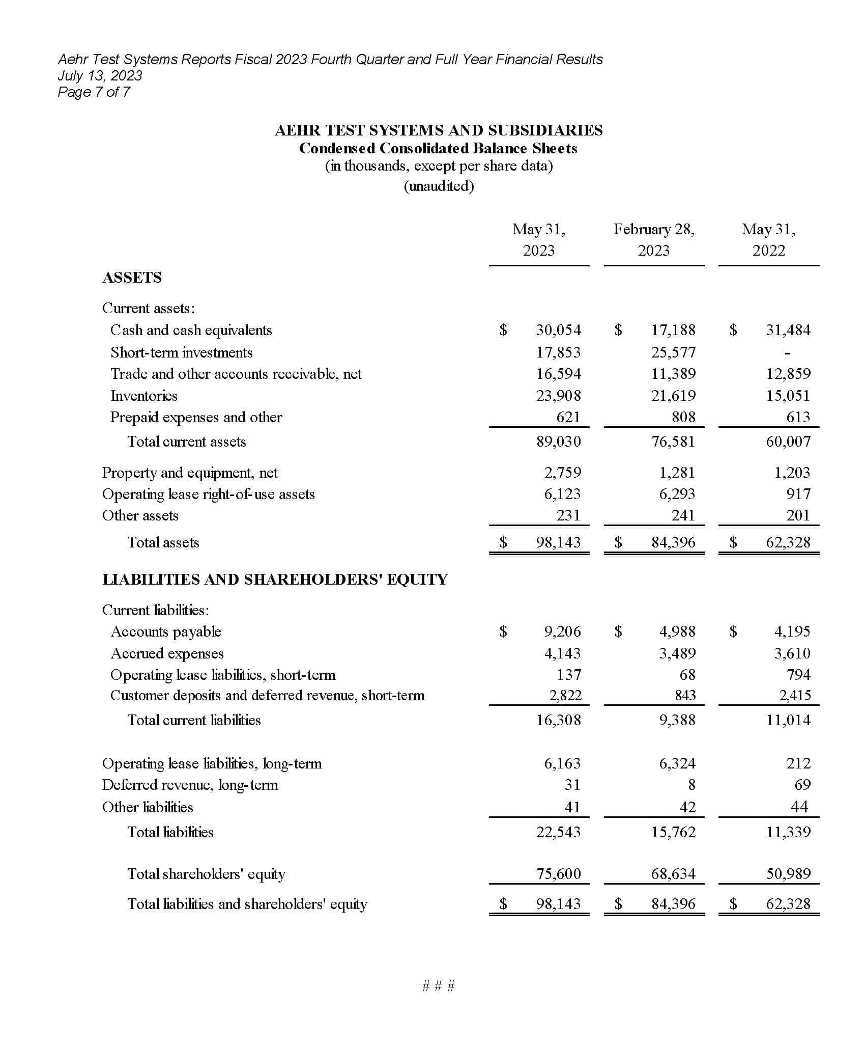 This press release contains certain forward-looking statements within the meaning of Section 27A of the Securities Act of 1933 and Section 21E of the Securities Exchange Act of 1934. Forward-looking statements generally relate to future events or Aehr’s future financial or operating performance. In some cases, you can identify forward-looking statements because they contain words such as “may,” “will,” “should,” “expects,” “plans,” “anticipates,” “going to,” “could,” “intends,” “target,” “projects,” “contemplates,” “believes,” “estimates,” “predicts,” “potential,” “sees,” or “continue,” or the negative of these words or other similar terms or expressions that concern Aehr’s expectations, strategy, priorities, plans, or intentions. Forward-looking statements in this press release include, but are not limited to, Aehr’s ability to generate bookings and revenue increases in the future; future requirements and orders of Aehr’s new and existing customers; bookings forecasted for proprietary WaferPakTM and DiePak consumables across multiple market segments; the temporary nature of customer pushouts; shipping timelines for products and follow-on capacity orders; the growth of Aehr’s systems and consumables, including as a percentage of total sales; financial guidance for fiscal 2024, including related to revenue and profitability, and expectations regarding fiscal 2024; Aehr’s ability to expand its number of customers using its FOX-PTM solutions; the ability to secure potential customer engagements; and expectations related to long-term demand for Aehr’s productions and the attractiveness of key markets. The forward-looking statements contained in this press release are also subject to other risks and uncertainties, including those more fully described in Aehr’s recent 10-K, 10-Q and other reports filed from time to time with the Securities and Exchange Commission. Aehr disclaims any obligation to update information contained in any forward-looking statement to reflect events or circumstances occurring after the date of this press release.