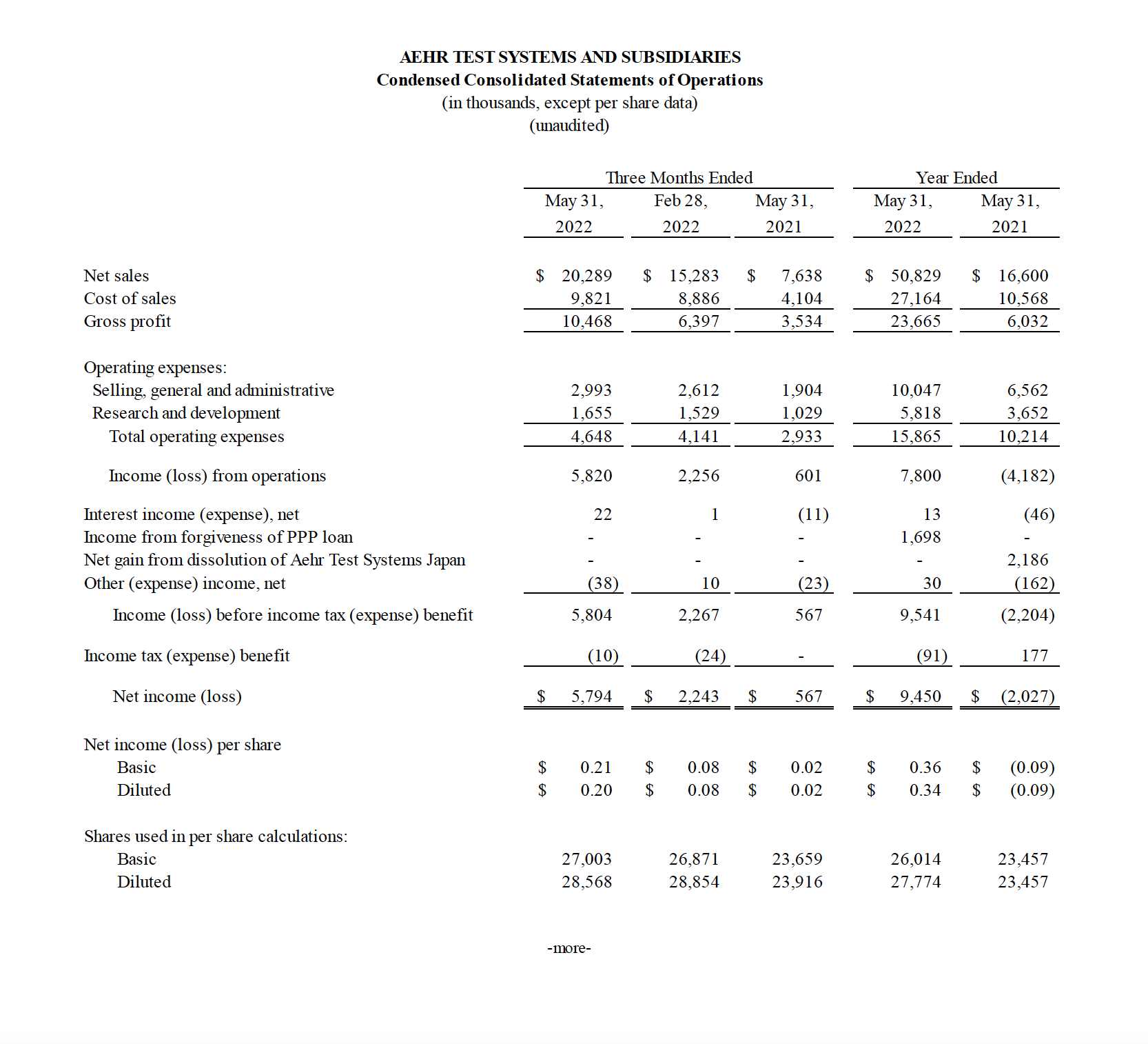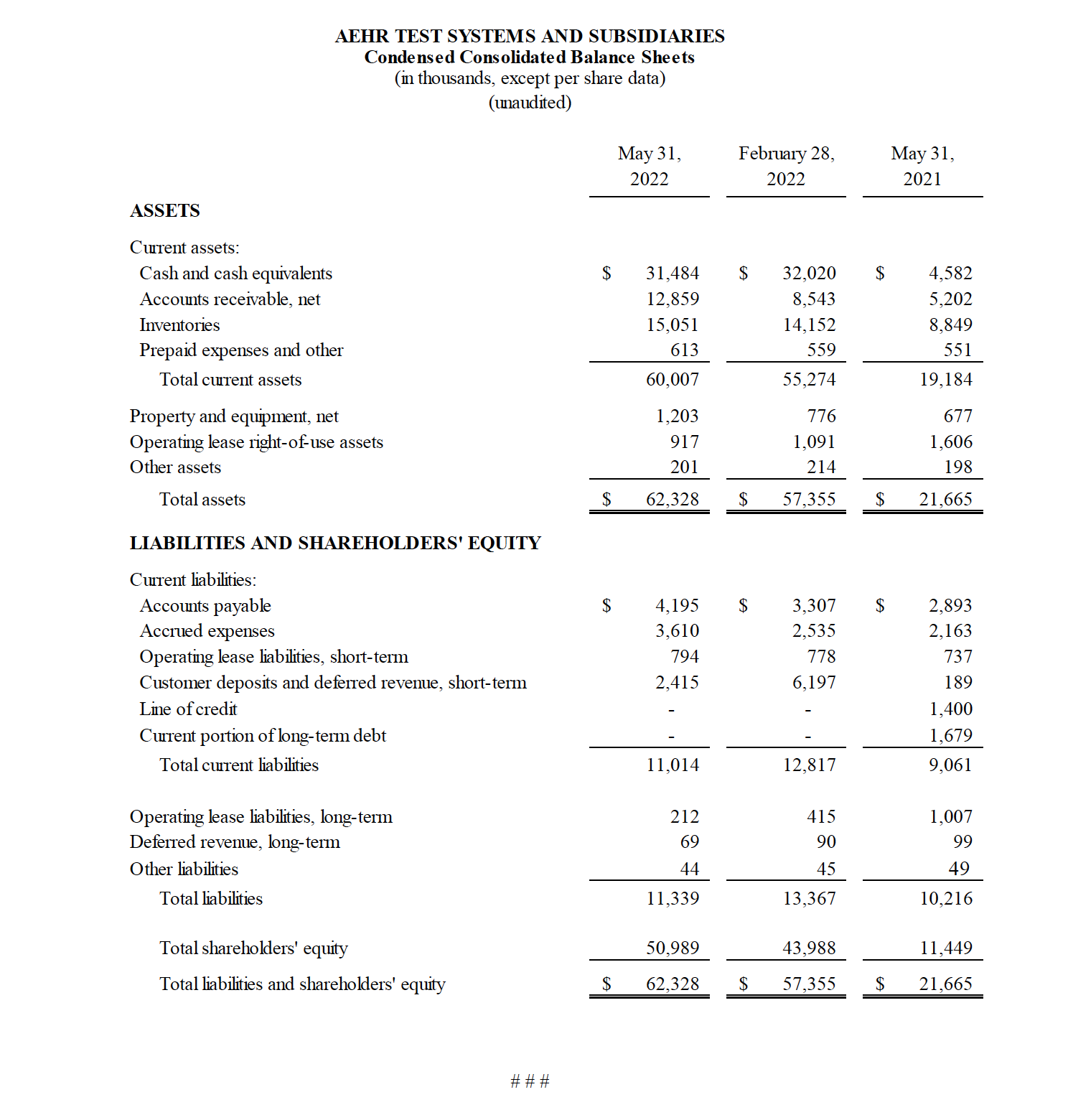 Fremont, CA (July 19, 2022) – Aehr Test Systems (NASDAQ: AEHR), a worldwide supplier of semiconductor test and reliability qualification equipment, today announced financial results for its fiscal 2022 fourth quarter and full year ended May 31, 2022.