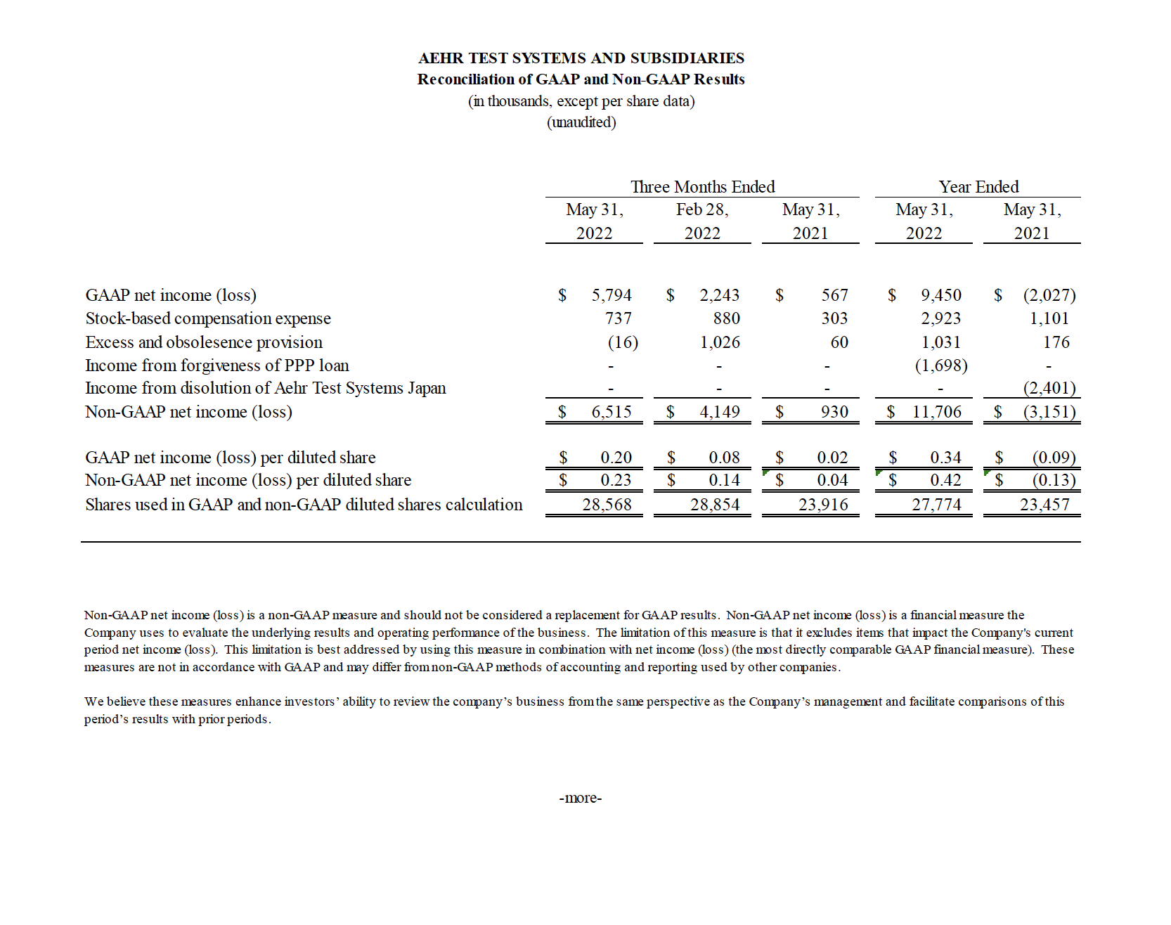 An explanation of the use of non-GAAP financial measures and a reconciliation of Aehr’s non-GAAP financial measures to the most directly comparable GAAP financial measures can be found in the accompanying tables.