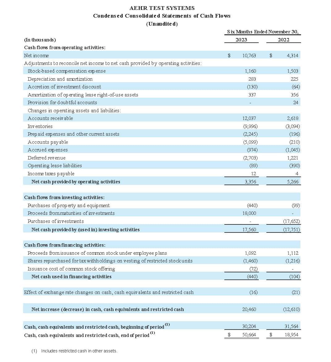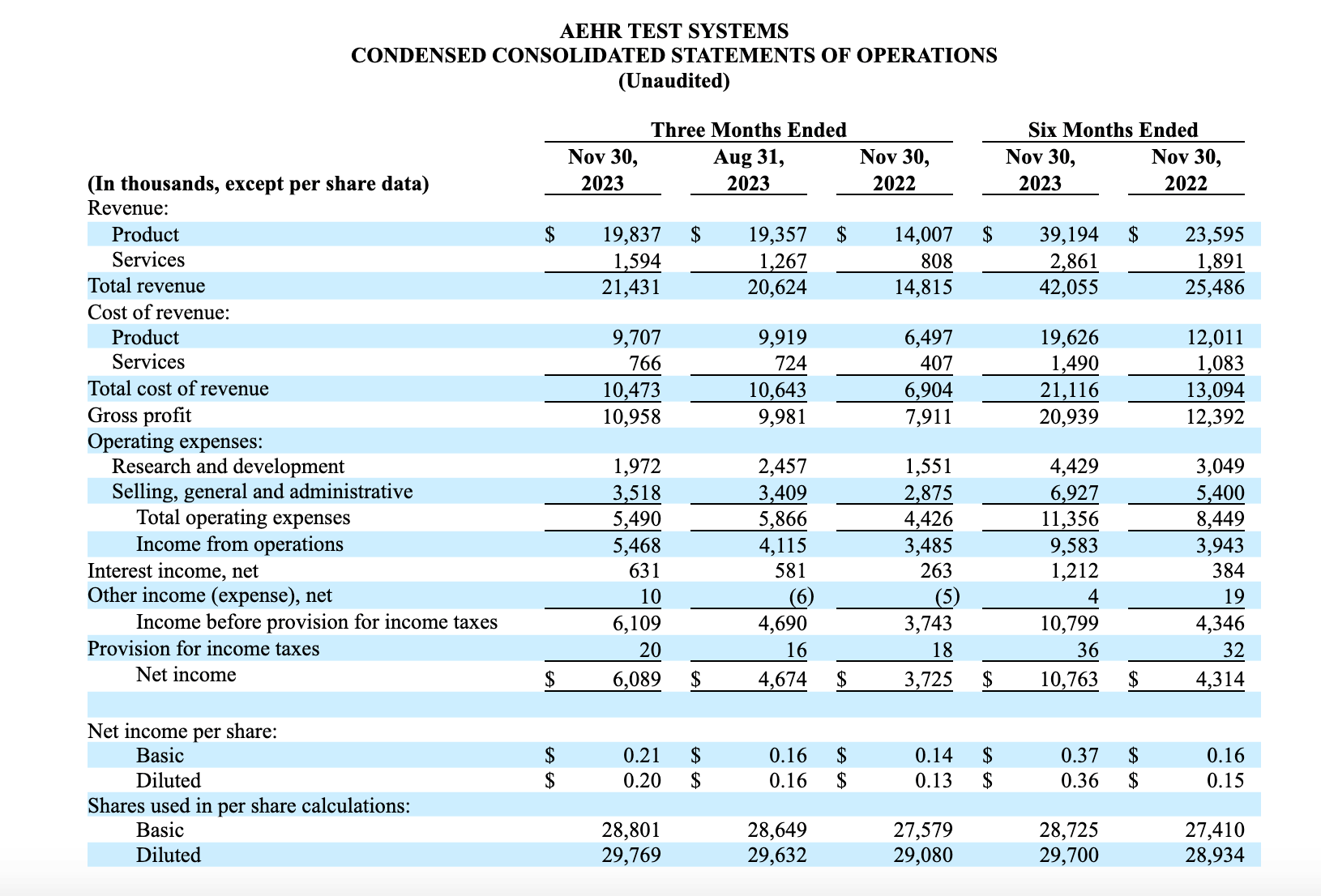 Fremont, CA (January 9, 2024) – Aehr Test Systems (NASDAQ: AEHR), a worldwide supplier of semiconductor test and burn-in equipment, today announced financial results for its second quarter of fiscal 2024 ended November 30, 2023.