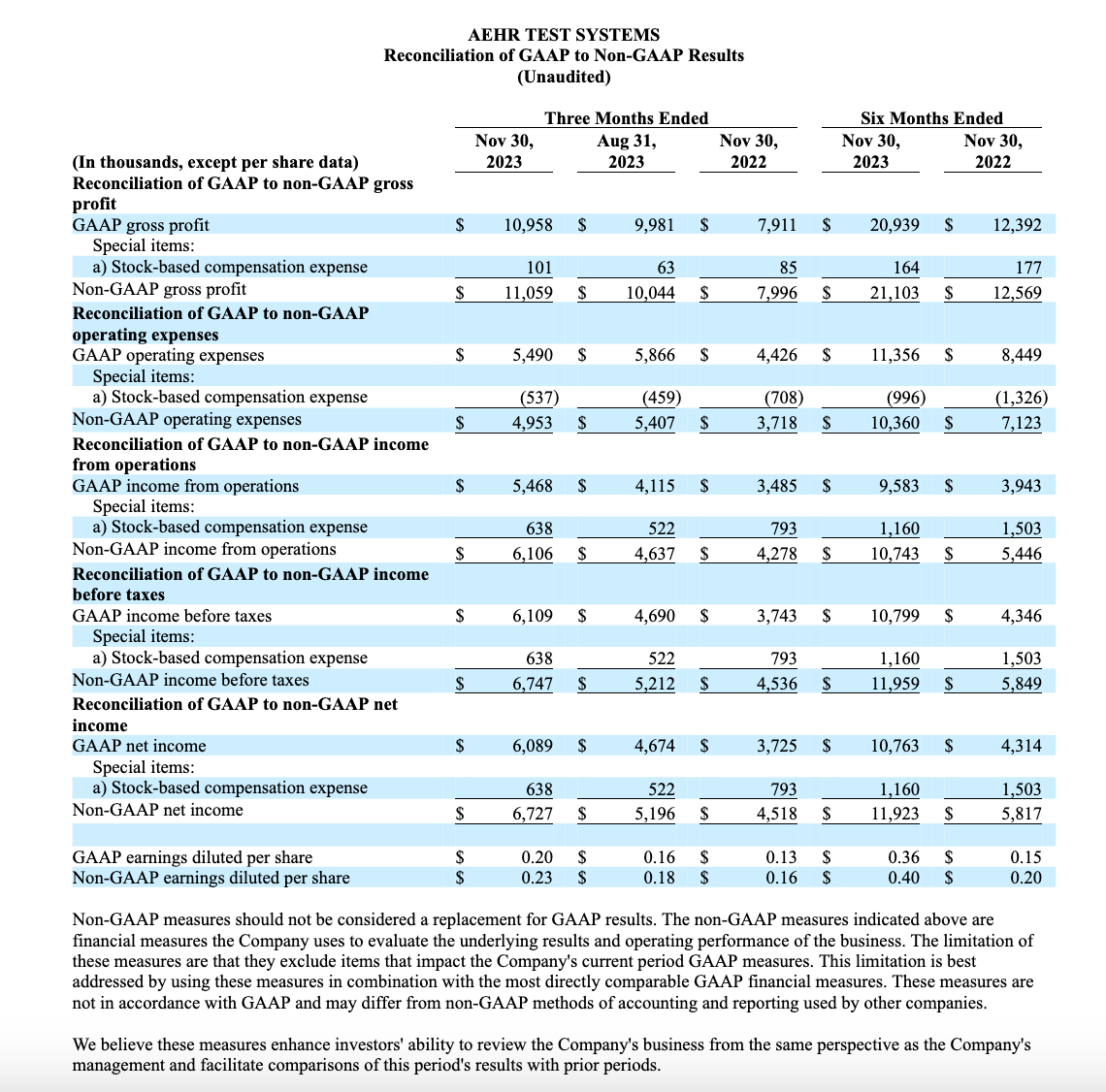 An explanation of the use of non-GAAP financial measures and a reconciliation of Aehr’s non-GAAP financial measures to the most directly comparable GAAP financial measures can be found in the accompanying tables.
