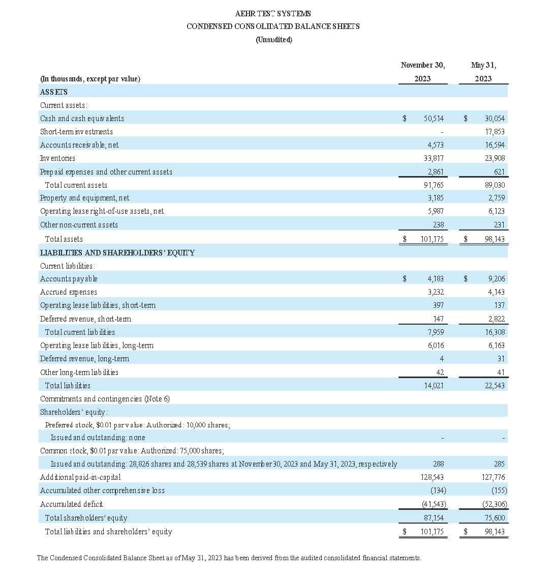 This press release contains certain forward-looking statements within the meaning of Section 27A of the Securities Act of 1933 and Section 21E of the Securities Exchange Act of 1934. Forward-looking statements generally relate to future events or Aehr’s future financial or operating performance. In some cases, you can identify forward-looking statements because they contain words such as “may,” “will,” “should,” “expects,” “plans,” “anticipates,” “going to,” “could,” “intends,” “target,” “projects,” “contemplates,” “believes,” “estimates,” “predicts,” “potential,” “sees,” or “continue,” or the negative of these words or other similar terms or expressions that concern Aehr’s expectations, strategy, priorities, plans, or intentions. Forward-looking statements in this press release include, but are not limited to, Aehr’s ability to generate bookings and revenue increases in the future; the timing of Aehr’s ability to recognize revenue; future requirements and orders of Aehr’s new and existing customers; bookings forecasted for proprietary WaferPakTM and DiePak consumables across multiple market segments; shipping timelines for products and new and follow-on capacity orders; the impact of shifting sales mix on revenue; the growth of Aehr’s systems and consumables, including as a percentage of total revenue; financial guidance for fiscal 2024, including related to revenue and profitability, and expectations regarding fiscal 2024; Aehr’s ability to expand its number of customers using its FOX-PTM solutions and the timing of such expansion; the ability to secure potential customer engagements and Aehr’s plans to meet with potential new customers and end users; expectations related to long-term demand for Aehr’s products; market opportunity expansion; the growth and attractiveness of key markets and Aehr’s ability to receive orders and generate revenue in the future. The forward-looking statements contained in this press release are also subject to other risks and uncertainties, including those more fully described in Aehr’s recent 10-K, 10-Q and other reports filed from time to time with the Securities and Exchange Commission. Aehr disclaims any obligation to update information contained in any forward-looking statement to reflect events or circumstances occurring after the date of this press release.