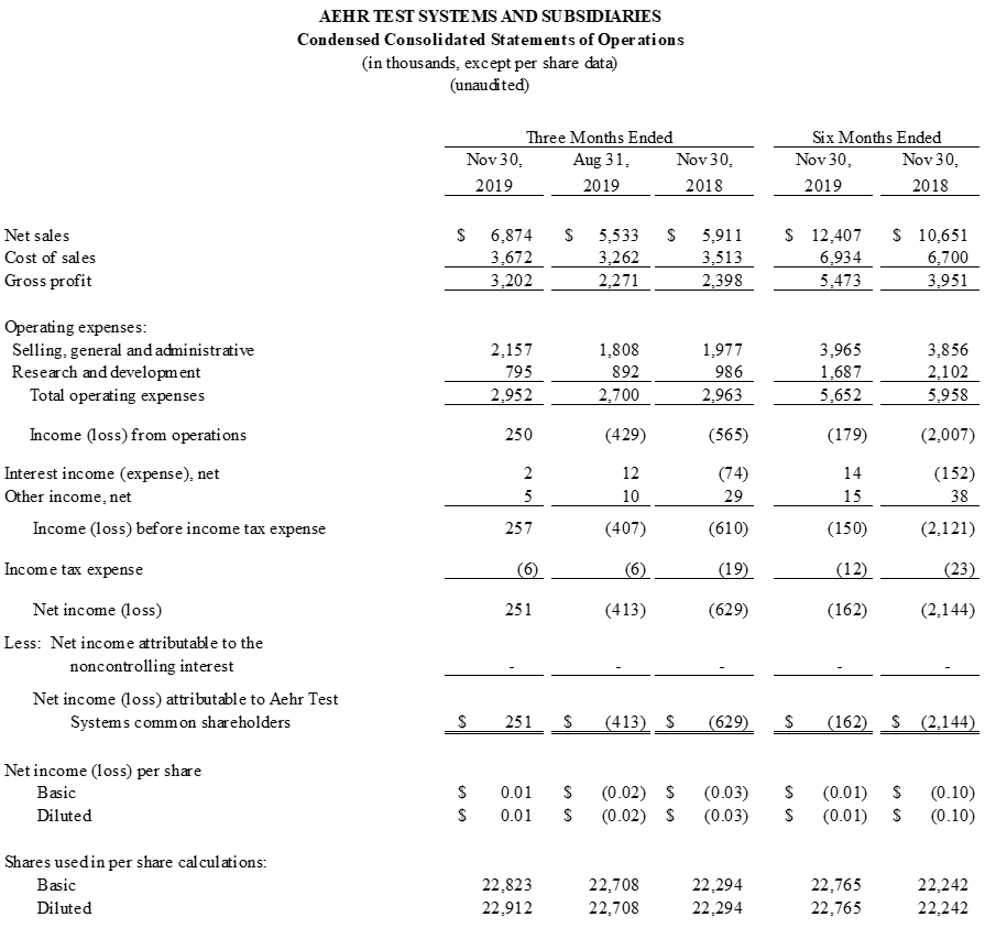 Aehr Test Systems will host a conference call and webcast today at 5:00 p.m. Eastern (2:00 p.m. PT) to discuss its second quarter fiscal 2020 operating results. To access the call dial 800-458-4121 (+1 323-794-2093 outside the United States) and give the participant pass code 3970795. In addition, a live and archived webcast of the conference call will be available over the Internet at www.aehr.com in the Investor Relations section. A replay of the conference call will also be available via telephone beginning approximately two hours after conclusion of the call through 8:00 p.m. ET on January 16, 2020. To access the replay dial-in information, please click here.