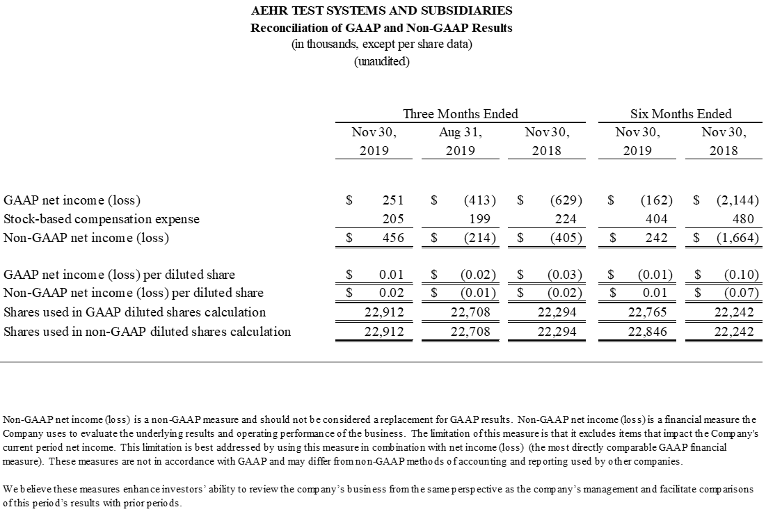 This press release contains certain forward-looking statements based on current expectations, forecasts and assumptions that involve risks and uncertainties. These statements are based on information available to Aehr as of the date hereof and actual results could differ materially from those stated or implied due to risks and uncertainties. Forward-looking statements include statements regarding Aehr’s expectations, beliefs, intentions or strategies regarding its products and financial guidance, including statements regarding future market opportunities and conditions, expected product shipment dates, customer orders or commitments and future operating results. These risks and uncertainties include, without limitation, customer demand and acceptance of Aehr’s products, the ability of new products to meet customer needs or perform as described, as well as general market conditions, the deployment of new technologies, such as 5G networks, and Aehr’s ability to execute on its business strategy. See Aehr’s recent 10-K, 10-Q and other reports from time to time filed with the Securities and Exchange Commission for a more detailed description of the risks facing Aehr’s business. Aehr disclaims any obligation to update information contained in any forward-looking statement to reflect events or circumstances occurring after the date of this press release.