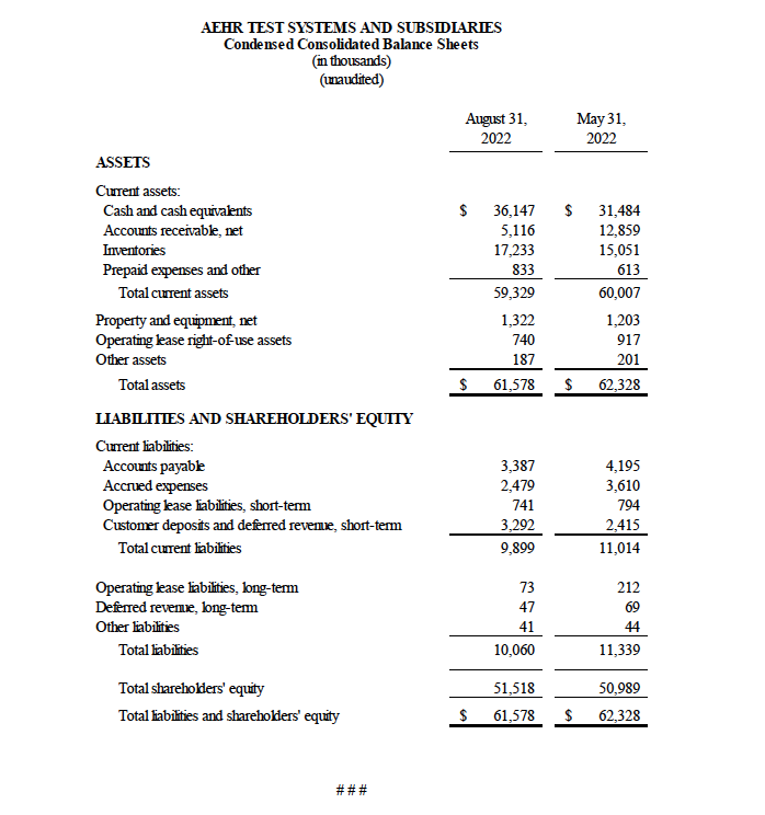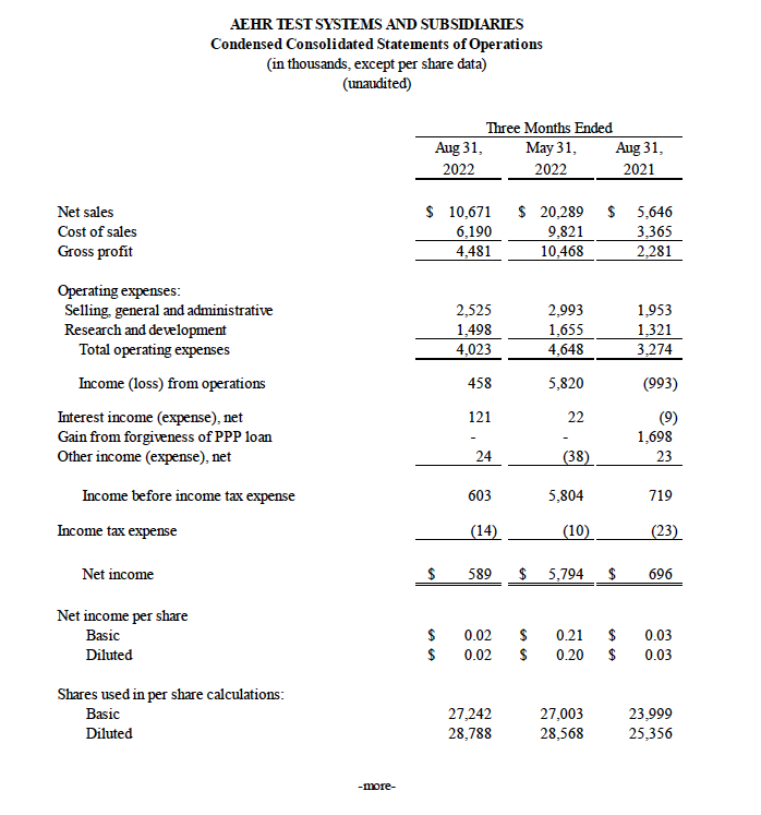 Fremont, CA (October 6, 2022) – Aehr Test Systems (NASDAQ: AEHR), a worldwide supplier of semiconductor test and reliability qualification equipment, today announced financial results for its first quarter of fiscal 2023 ended August 31, 2022.