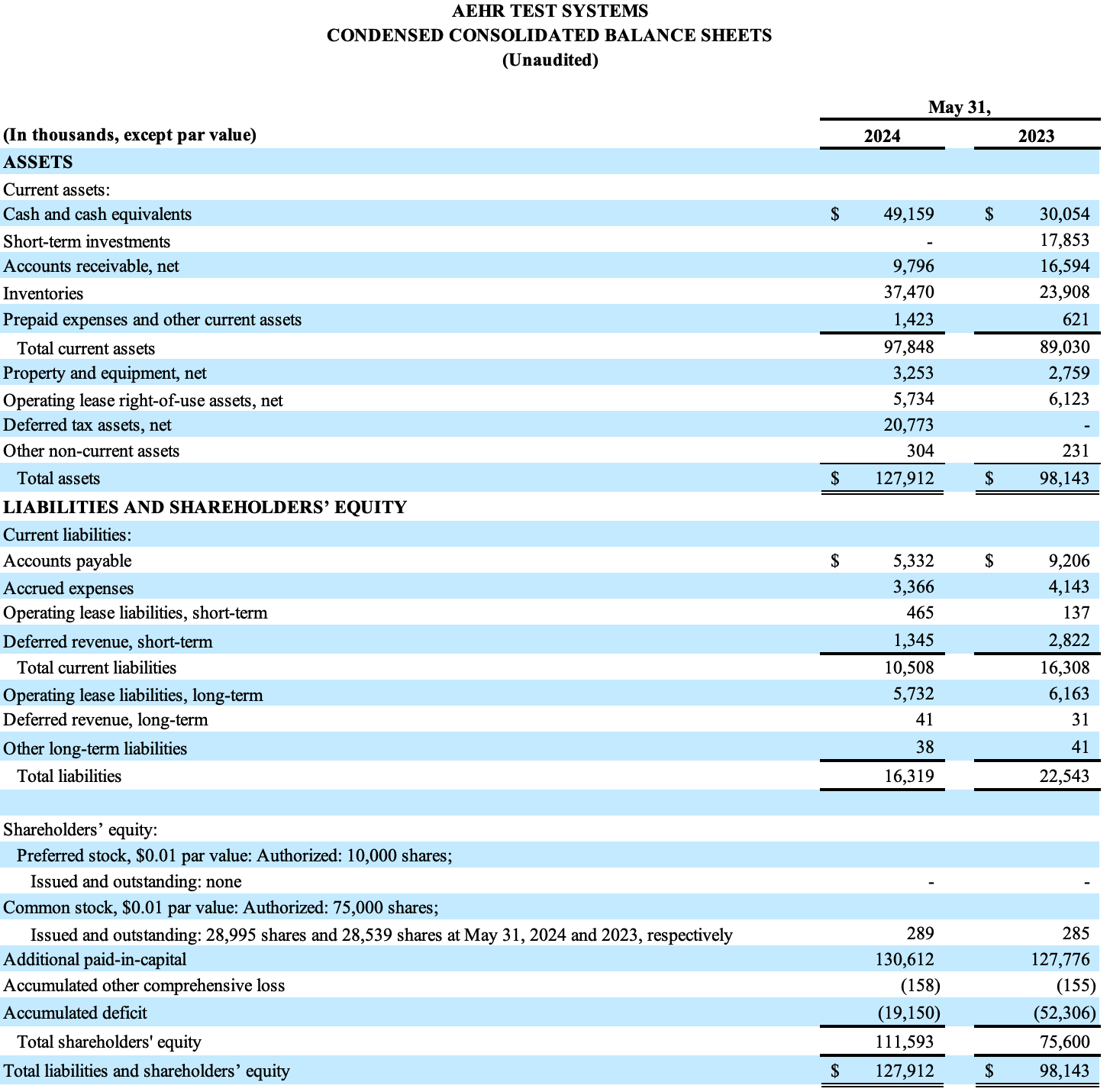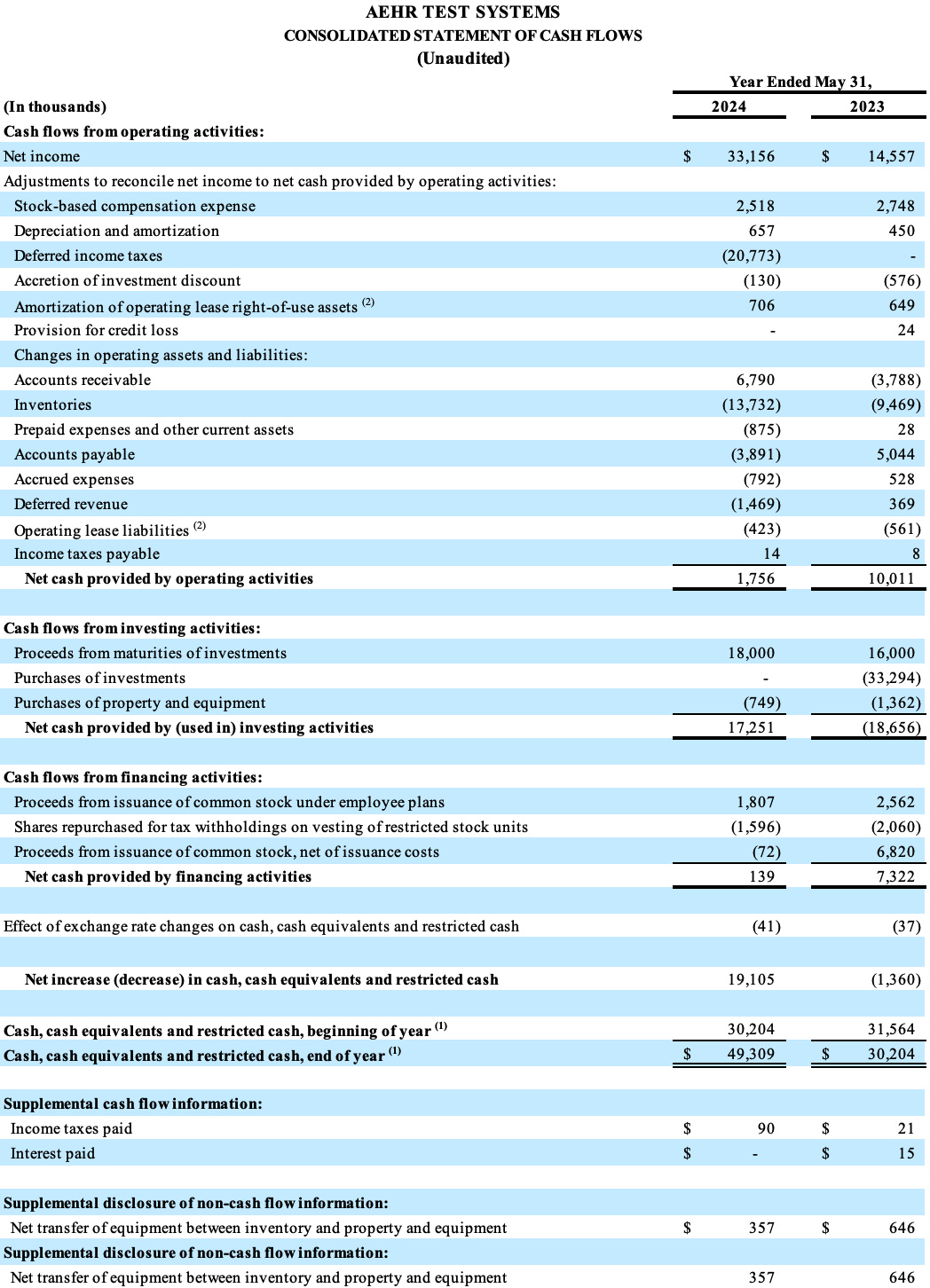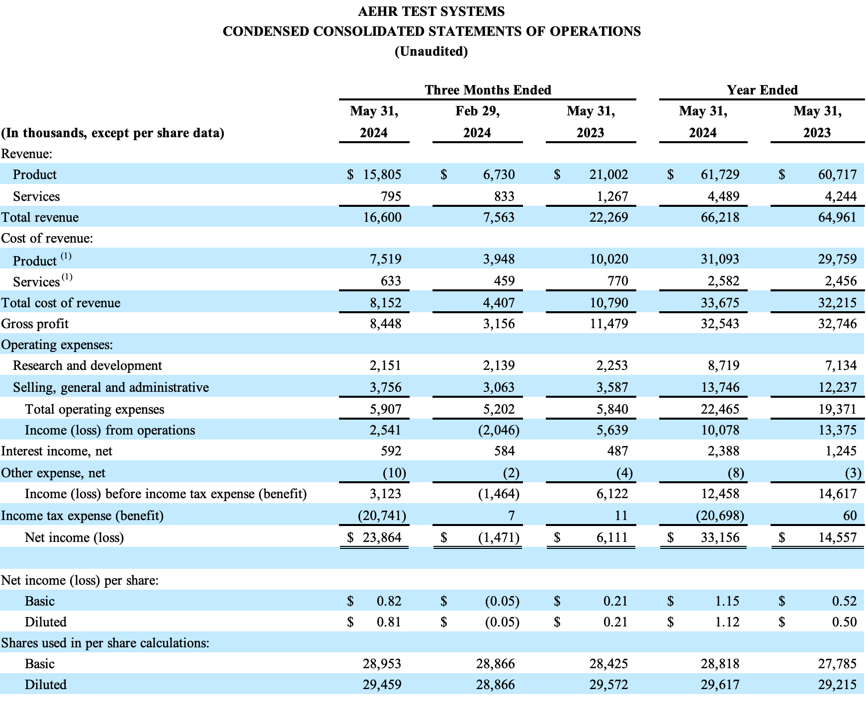 Fremont, CA (July 16, 2024) – Aehr Test Systems (NASDAQ: AEHR), a worldwide supplier of semiconductor test and burn-in equipment, today announced financial results for its fiscal 2024 fourth quarter and full year ended May 31, 2024.
