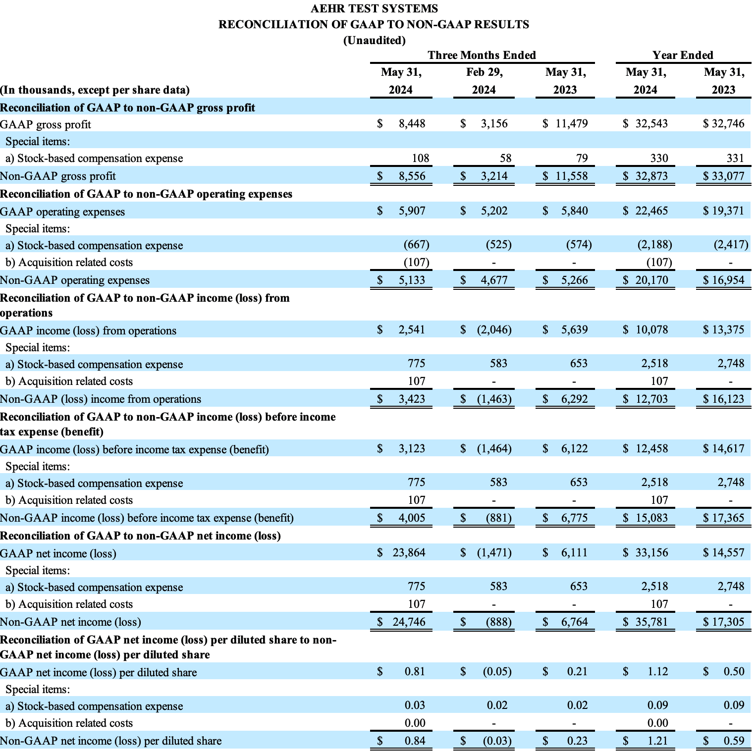 An explanation of the use of non-GAAP financial measures and a reconciliation of Aehr’s non-GAAP financial measures to the most directly comparable GAAP financial measures can be found in the accompanying tables.