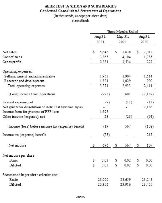 - GAAP net income was $696,000, or $0.03 per diluted share, which includes the impact of forgiveness of $1.7 million in loans from the Paycheck Protection Program (“PPP”) it received in fiscal 2020. This compares to GAAP net income of $107,000, or $0.00 per diluted share, in the first quarter of fiscal 2021, which includes the impact of a gain of $2.4 million related to the closure of Aehr’s Japan subsidiary during the quarter.