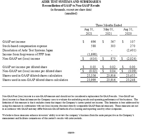 An explanation of the use of non-GAAP financial measures and a reconciliation of Aehr’s non-GAAP financial measures to the most directly comparable GAAP financial measures can be found in the accompanying tables.