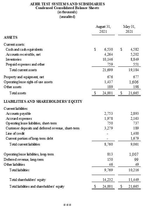 This press release contains certain forward-looking statements within the meaning of Section 27A of the Securities Act of 1933 and Section 21E of the Securities Exchange Act of 1934. Forward-looking statements generally relate to future events or Aehr’s future financial or operating performance. In some cases, you can identify forward-looking statements because they contain words such as “may,” “will,” “should,” “expects,” “plans,” “anticipates,” “going to,” “could,” “intends,” “target,” “projects,” “contemplates,” “believes,” “estimates,” “predicts,” “potential,” “sees,” or “continue,” or the negative of these words or other similar terms or expressions that concern Aehr’s expectations, strategy, priorities, plans, or intentions. Forward-looking statements in this press release include, but are not limited to, Aehr’s ability to generate bookings and revenue increases in the future, including the first quarter of fiscal 2022; future requirements and orders of Aehr’s new and existing customers; bookings forecasted for proprietary WaferPakTM and DiePak consumables across multiple market segments; the temporary nature of customer pushouts; shipping timelines for products and follow-on capacity orders; the growth of Aehr’s systems and consumables, including as a percentage of total sales; financial guidance for fiscal 2022, including related to revenue and profitability, and expectations regarding fiscal 2022; Aehr’s ability to expand its number of customers using its FOX-PTM solutions; the ability to secure potential customer engagements; expectations related to long-term demand for Aehr’s productions and the attractiveness of key markets; the belief that Aehr will be stronger after the current worldwide COVID-19 pandemic, including expectations related to greater production, more customers, more applications, and higher value products. The forward-looking statements contained in this press release are also subject to other risks and uncertainties, including those more fully described in Aehr’s recent 10-K, 10-Q and other reports filed from time to time with the Securities and Exchange Commission. Aehr disclaims any obligation to update information contained in any forward-looking statement to reflect events or circumstances occurring after the date of this press release.