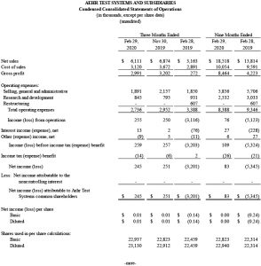 Fremont, CA (April 2, 2020) – Aehr Test Systems (NASDAQ: AEHR), a worldwide supplier of semiconductor test and reliability qualification equipment, today announced financial results for its third quarter of fiscal 2020 ended February 29, 2020.